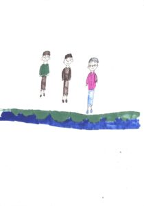 青空と朝顔とチューリップと家と木と信号機と横断歩道と車と信号機と藤原さんが私の肩と手助けしてくれてるシーンと内輪としゃぼん玉と電子オルガンと紙ボール