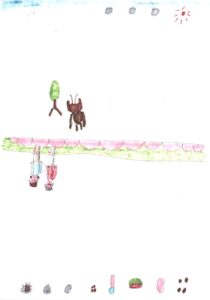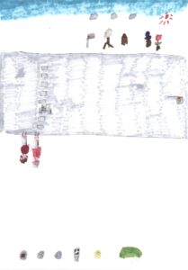 青空と朝顔とチューリップと家と木と信号機と横断歩道と車と藤原さんが私の肩と手助けしてくれてるシーンと焼きそばと餃子と肉まんと納豆とクーヘンとメロン
