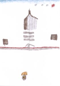 青空と朝顔とチューリップと家と木と信号機と横断歩道と車と藤原さんが私の肩と手助けしてくれてるシーンと焼きそばと餃子と肉まんとプッチンプリンとスプーンと納豆とミートボールとたこ焼きと飴 アーティスト S・Y
