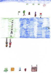 青空とチューリップと朝顔と家と木と信号機と横断歩道と藤原さんが私の肩と手助けしてくれてるシーンとブロックとピンクと積木とおもちゃとピアノ