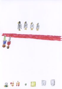 ペンギンと藤原さんが私の肩を支えて手助けしてくれてるシーンとブロックと剣玉とラケットとキャッチボールとアルバムと小さい時の写真に入ってる缶とお菓子の缶