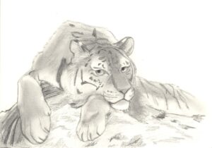 雪が積もる岩の上でくつろぐアムールトラ