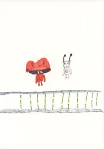 青空と木とゴリラと地面と藤原さんが私の肩と手助けしてくれるシーンとサッカーとバドミントンの羽とラケットのボールとパターゴルフと鯛焼き