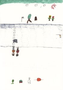 快晴と向日葵とチューリップと家と木と信号機と横断歩道と藤原さんが私の肩と手助けをしてくれるシーンとメロンと西瓜と硝子とチキン