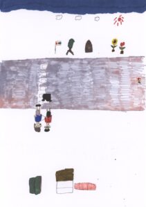 青空と向日葵とチューリップと家と木と信号機と横断歩道と藤原さんが私の肩と手助けとパイナップルと柿と林檎と素麺とえんどう豆と胡食