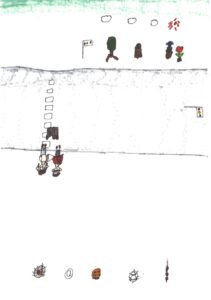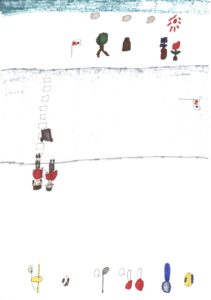晴天と朝顔とチューリップと家と木と信号機と横断歩道と車と信号機と藤原さんが私の肩と手助けしてくれてるシーンとけん玉とサッカーとゴルフとラケットとバドミントンとカレー