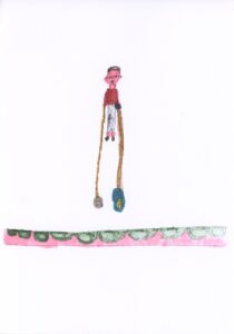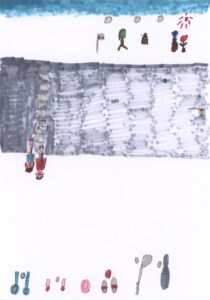 青空と朝顔とチューリップと家と木と信号機と横断歩道と車と藤原さんが私の肩と手助けしてくれてるシーンとバドミントンとラケットとゴルフとサッカーとバレーボールとビート板