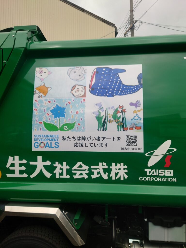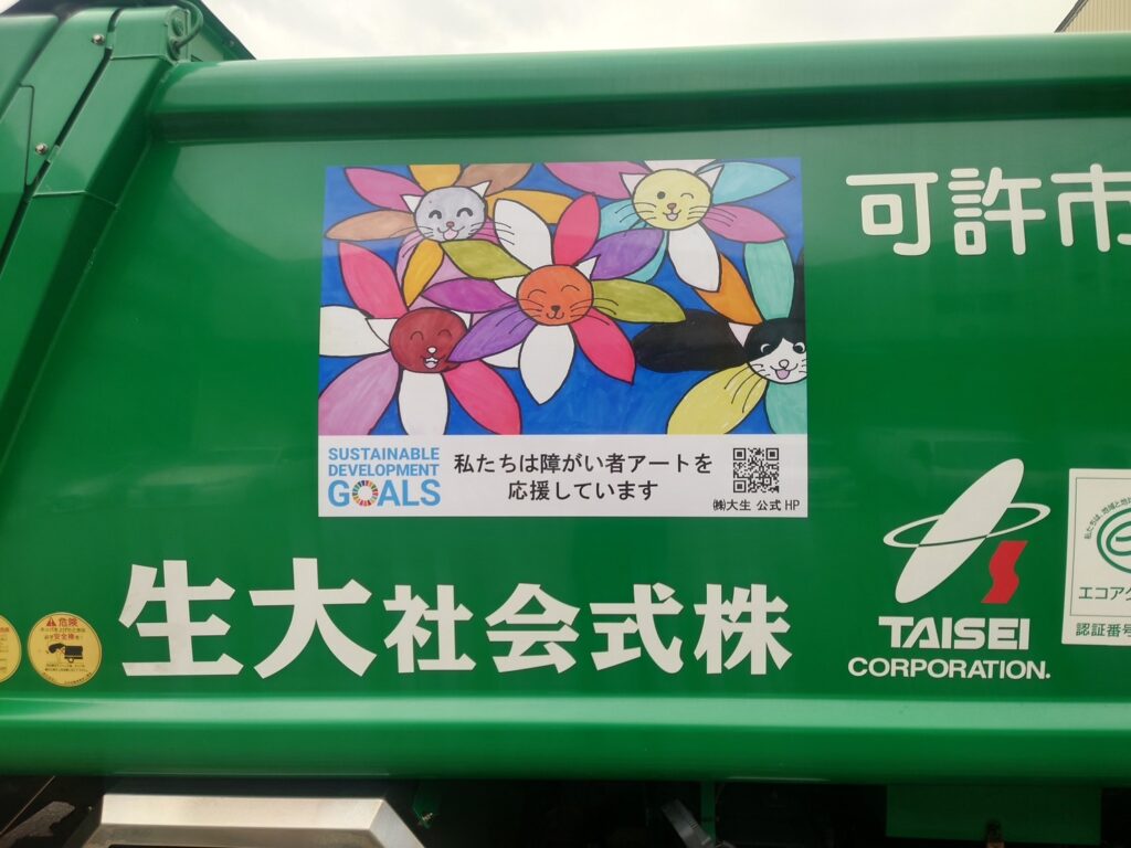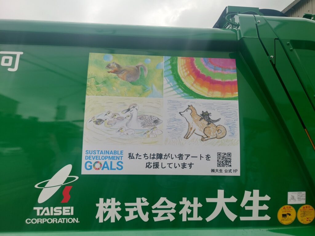 もらいました。街中をアート障がい者アート作品をパッカー車に貼って街中を走って頂いてます。